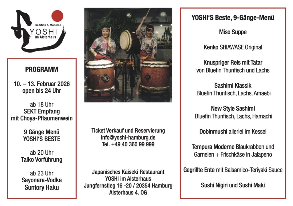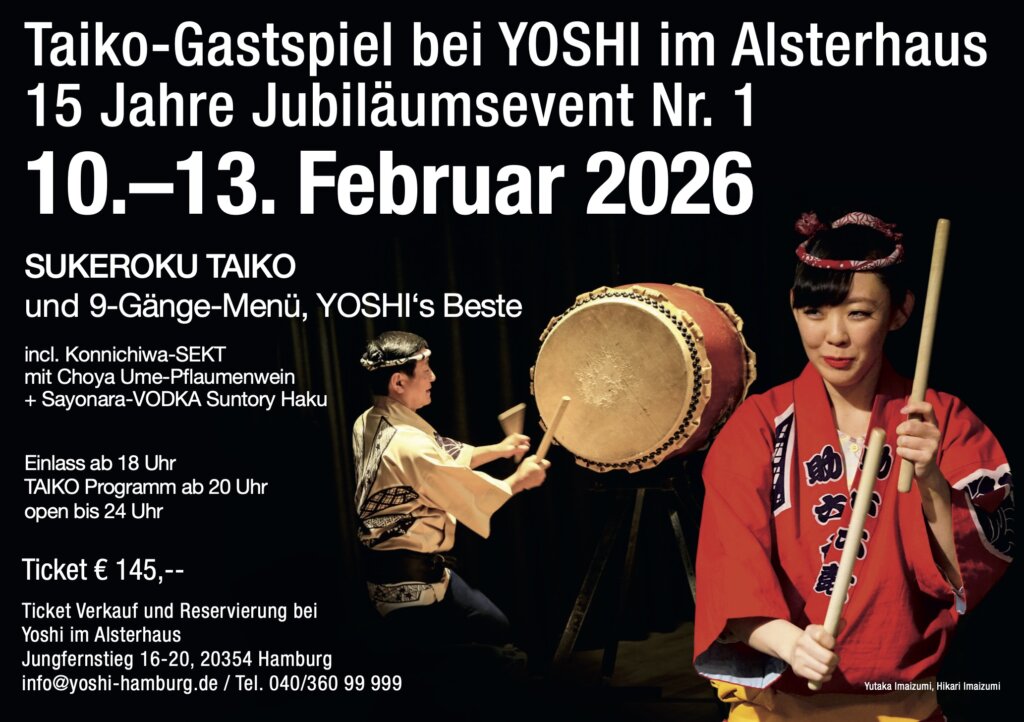 Diesen besonderen Taiko-Abend begleiten zwölf exquisite japanische Köstlichkeiten im YOSHI – und natürlich YOKO!Ich würde mich freuen, wenn Sie gemeinsam mit Freunden einen unvergesslichen japanischen Abend im YOSHI genießen.